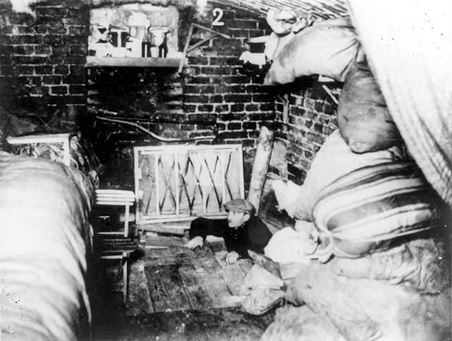 The front of Pinchas’s apartment building had been destroyed in the 1939 invasion and under this pile of rubble, his father and others built a bunker. They put in electricity and camouflaged air vents. The bunker could hold about 150 people and had two trap door entrances—one in Mila 3 and the other in Nalewki 49. It had two large rooms where everyone slept on the floor.